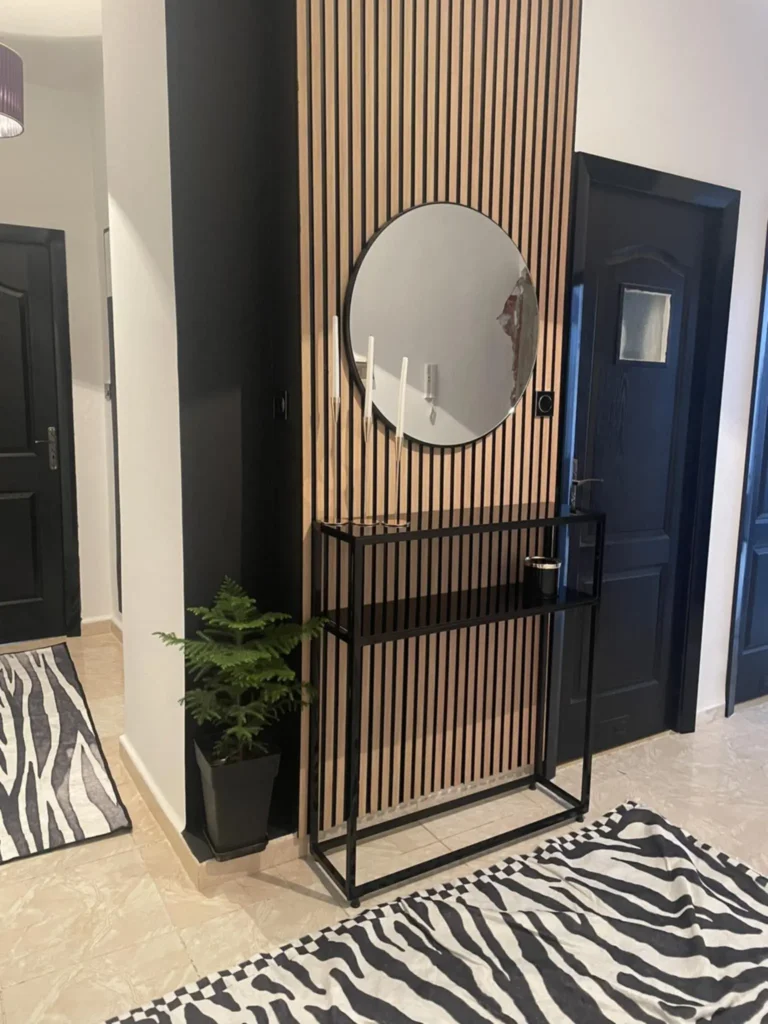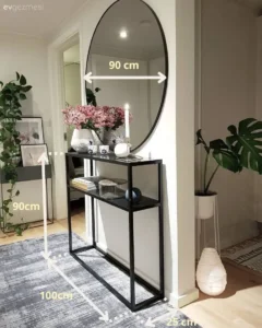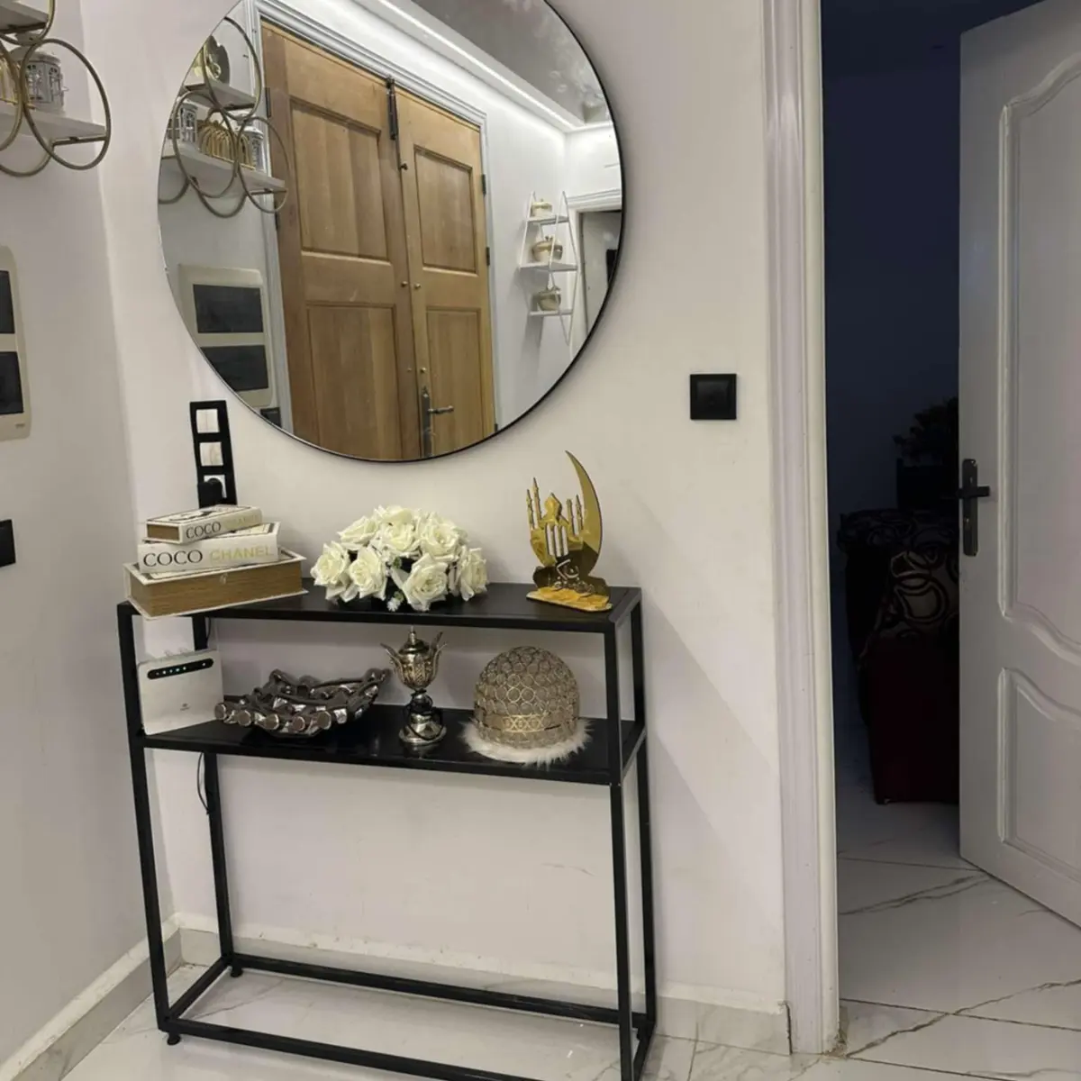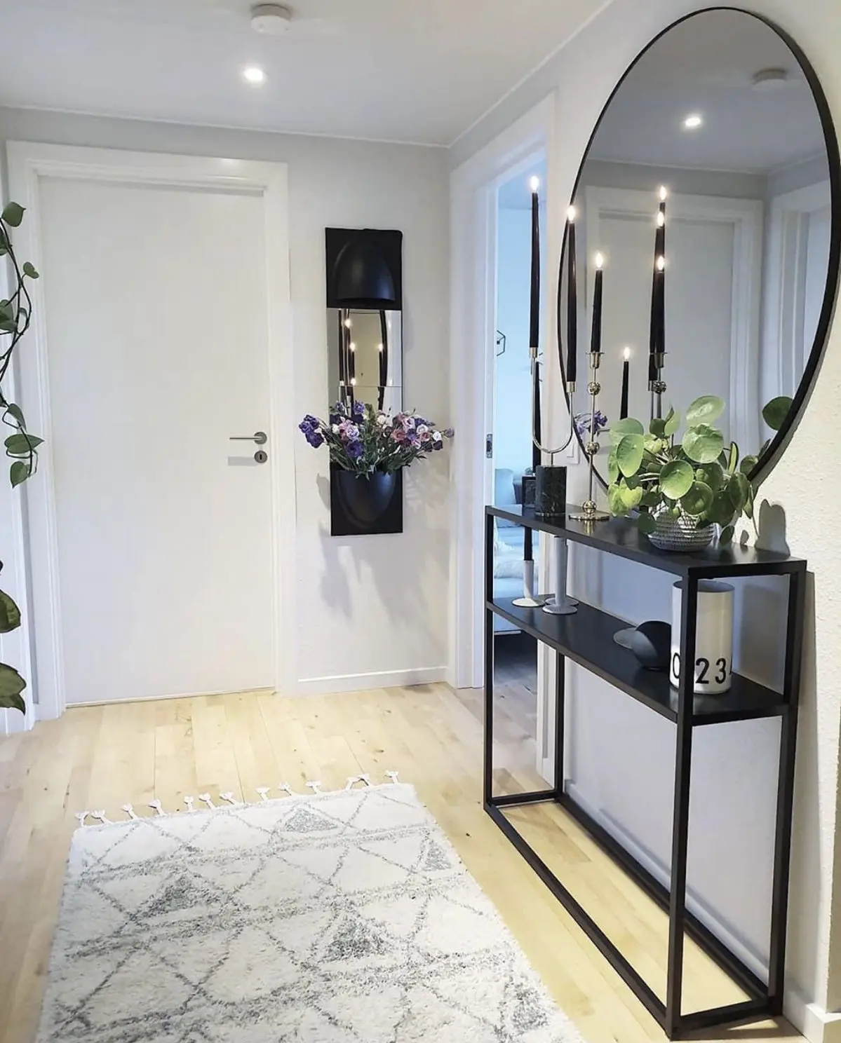 مرآة دائرية كبيرة تعطي إحساسًا بالاتساع وتزيد من إشراق المدخل.